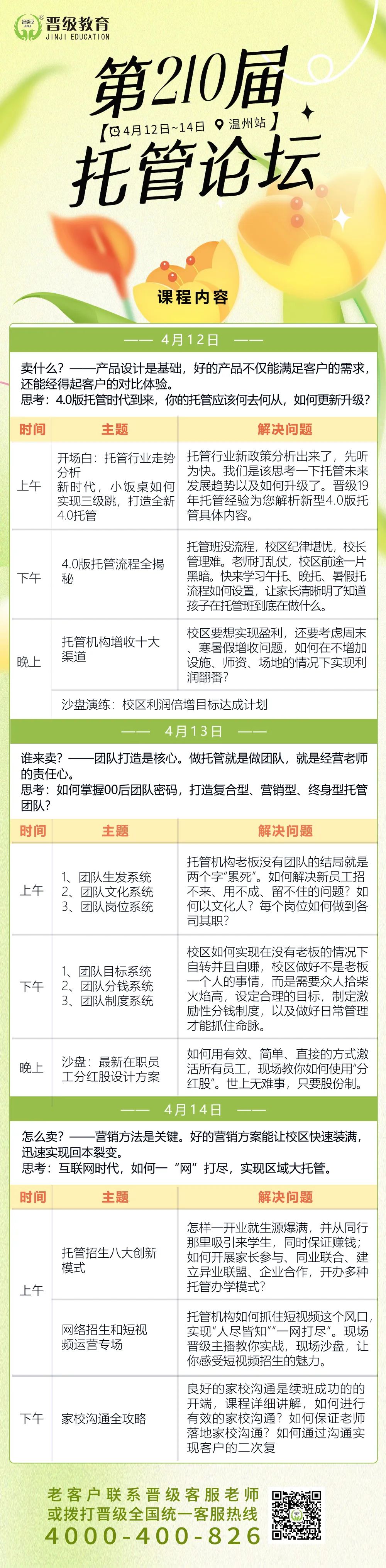 思考:招生作为头等大事,你是否足够重视?你是否做到了推陈出新,你的招生方案够刺激、够完善吗?还有没有可以“一网打尽”的办法呢?当然,不止以上种种,如果你正在为校区转型发愁,正在为寻找托管品牌为难,正在为校区续班忐忑、正在为校区装满头疼,晋级托管论坛绝对是你最好的选择!↓↓↓