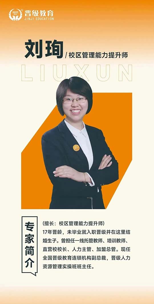 刘珣老师,2006年加入晋级,至今已有17年晋级工作经验,从托管一线老师做起,曾担任校区副校长、校长、人力资源主管、加盟中心总管,现任晋级教育副总裁,晋级教育专家讲师团高级讲师。曾担任晋级人力资源实操班班主任、品牌托管师训会讲师,至今已培养出上千名校长和老师,擅长校区运营和团队管理。