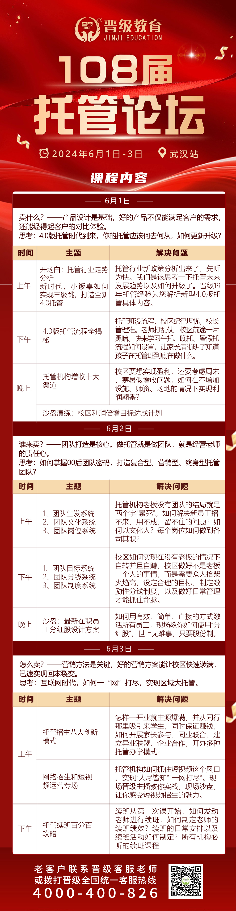 思考:招生作为头等大事,你是否足够重视?你是否做到了推陈出新,你的招生方案够刺激、够完善吗?还有没有可以“一网打尽”的办法呢?当然,不止以上种种,如果你正在为校区转型发愁,正在为寻找托管品牌为难,正在为校区续班忐忑、正在为校区装满头疼,晋级托管论坛绝对是你最好的选择!